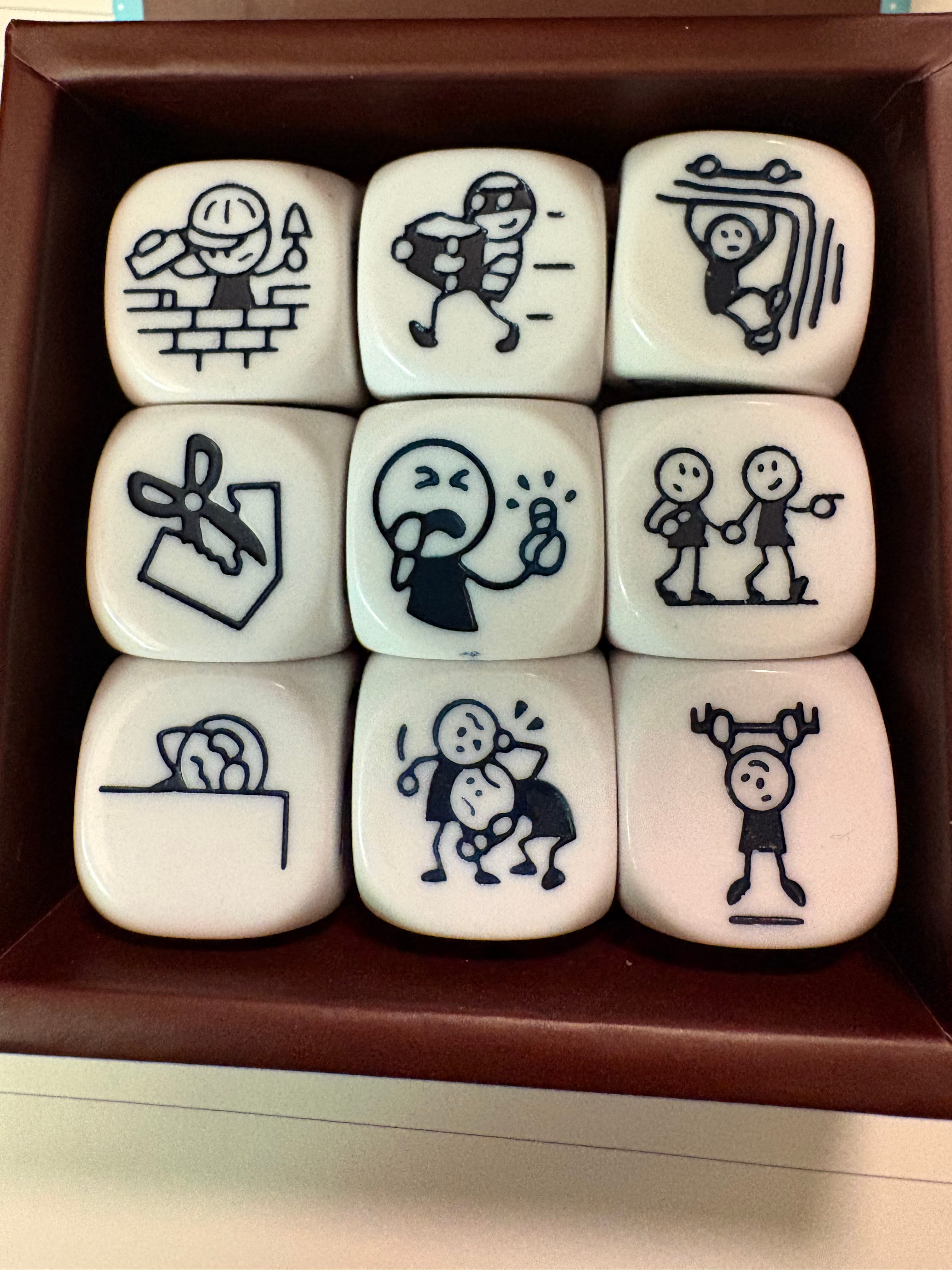 Write a story including all nine of the actions shown on the cubes (see photo of the cubes in the next section). Here is the group’s interpretation of the images on the cubes.